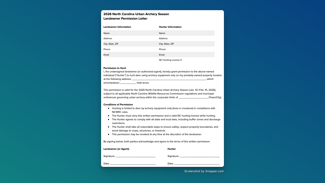 FREE SAMPLE: NC Urban Archery Landowner Permission Letter